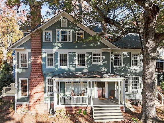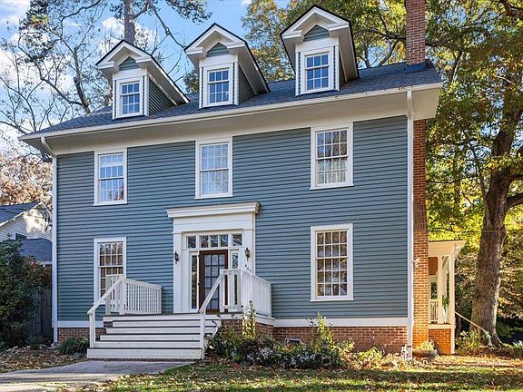 Just 1 block from the UNC Chapel Hill campus and in the heart of the Cameron-McCauley Historic District, this colonial-revival home exudes historical character, charm, and offers an endless list of features. Covered porches welcome you on 3 sides and multiple dormers accent the clapboard-sided exterior. This 5 bedroom/3 bath home has a renovated interior and is currently configured as a 2-story single family residence with 2 attached rental apartments on the main floor (each apartment has 1 bedroom/1 bath). Remodeled kitchen and baths in the main house (done in 2016) including a gorgeous primary bath complete with tile floor, double vanity, stand-alone tub and shower. Hardwood floors throughout, true divided-light leaded glass windows, vintage moldings, trim, and door hardware compliment the historic features. A cozy office is perfect for private virtual meetings with built-in bookshelves and a desk of 200+ year-old wood. Outdoor entertaining is easy with ample parking, an oversized stone patio and firepit, as well as a tree house in the fenced rear yard. A 2-car detached garage makes a great workshop and offers a spacious storage attic. New roof ('25) and exterior paint ('25). Apartments provide great rental income to offset your mortgage or expenses! This is the perfect opportunity to live in the heart of town, and enjoy everything Chapel Hill has to offer!