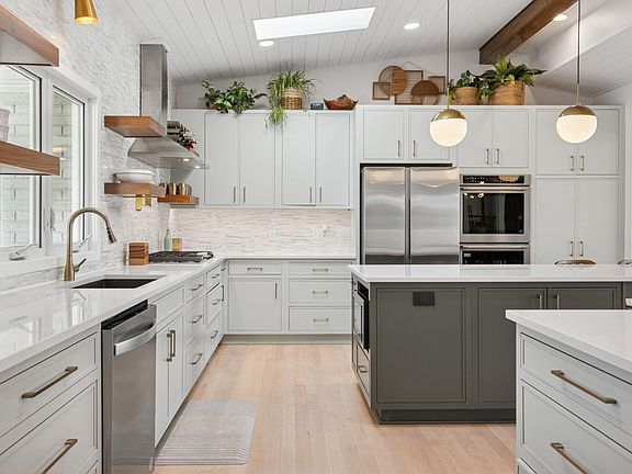 lAKESHORE! Stylish fully updated walk-out rambler on Alimagnet Lake. You'll love the real hardwood floors, open floor plan with vaulted ceilings and mid-century vibes, and stunning lake views! Every inch has been remodeled over the past 10 years. Roof, siding, windows, baths, kitchen, spray foam insulation, roughed-in for electrical car charger. See supplemental list of updates! Three bedrooms on the main including a primary suite with private bath. Five bedrooms and 4 baths total. Huge front yard perfect for sport or gardening. Take advantage of the lake for fun, fishing, and sport. End each day relaxing in the hot tub while watching the sunset. Includes dock and boat lift! Forget the cabin! Live the lake life full-time!
