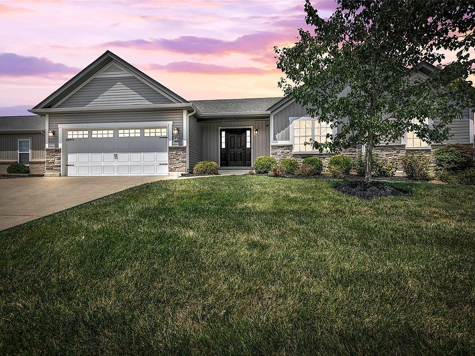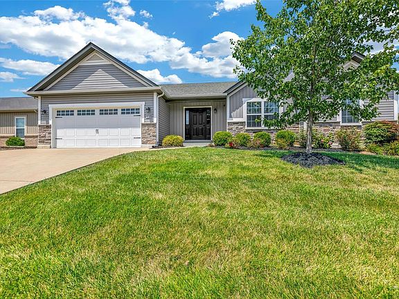 Discover the perfect ranch home in Wentzville! This 3 bed 2 bath gem features a charming vinyl and stone elevation and an oversized driveway for your convenience. With just 9 years of age, this home offers modern construction and peace of mind. Boasting 1706 sqft of living space, you'll enjoy the beauty of hardwood floors throughout. Vaulted ceilings add a touch of elegance to the open layout. The custom kitchen cabinets and granite countertops are sure to impress. The bathrooms also feature granite tops for a luxurious feel. The spacious master bedroom and bathroom offer a custom tile shower with 3 shower heads, creating a spa-like experience. The open floor plan seamlessly flows to a large patio, perfect for entertaining or relaxing. The basement is fully framed and ready! With an egress window for an additional room. A full bath, office space, and most of the plumbing, electrical, and HVAC work are already complete. Don't miss out on the opportunity to make this home your own!