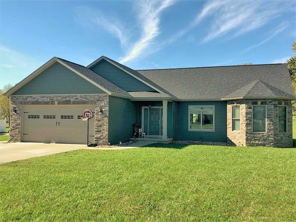 OPEN FLOOR PLAN, 3 BR, 3-1/2 BA home with full basement. Grand primary bedroom and en suite with double sinks and large walk-in shower, trey ceiling and walk-in closet. The laundry room which has a half bath is off attached 2-car garage. Split floor plan puts the other two bedrooms and full bath on the other side of the home. A large open great room hosts the main living area, a well-designed kitchen with island and dining area which leads to a concrete patio out back. The full basement has a newly finished full bath and can be finished to be any sort of space you desire. The home sits on a large .816 acre level lot. Eastside location near shopping, restaurants, by-pass and I-69 main exit. Underground pet fence included (without receiver). IMMEDIATE POSSESSION.