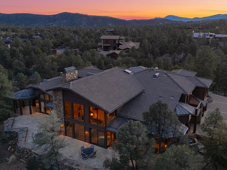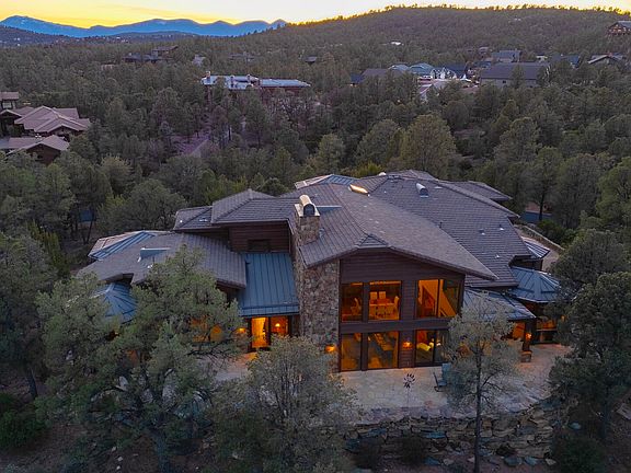 Welcome to this extraordinary residence nestled within the scenic beauty of The Rim Golf Club in Payson, Arizona. This custom-built home by Amon Builders showcases unparalleled craftsmanship and stunning features. Positioned along the 5th fairway on a cul-de-sac, this 6357± sq.ft. home offers breathtaking views of the golf course and majestic mountains. Boasting five bedrooms and six bathrooms, this residence is designed for comfort and luxury living. The main level features the primary bedroom with a full bathroom, including a jetted tub, dual closets, and a workout room with access to a gazebo and patio that is wired with 220v for a hot tub. The foyer welcomes you with Cantera doors leading into the great room adorned with 3/4'' solid hickory wood floors, floor-to-ceiling windows facing east for morning sunrises, and a striking floor-to-ceiling stone fireplace. Vaulted ceilings and a formal dining area add to the grandeur. The office is equipped with built-in bookshelves, large windows, and a fireplace. The large gourmet kitchen is a chef's delight, featuring a Wolf gas six-burner cooktop, two Wolf ovens, Sub-Zero refrigerator, Whirlpool dishwasher, a spacious island with a prep sink, and a large pantry. Enjoy magnificent views from the kitchen, eat-in dining area, and the adjacent screened outdoor patio. The first floor guest quarters offer an ensuite bath for added privacy. A half bathroom with an onyx countertop and stylish lighting is conveniently located off the kitchen. The upper level includes two ensuites with ¾ bathrooms, a loft sitting area with built-in shelving, a den or bedroom with a refrigerator and northern-facing views of the Mogollon Rim. Additionally, a large hobby, storage, or multi-purpose room with a half bathroom and ample storage space completes the upper level. The outdoor spaces feature a screened porch, covered patio, fireplace, wood and iron railing, flagstone patio, rocked walls for seating, and natural landscaping with a drip system. Loewen windows, four A/C and propane heater systems, two tankless hot water systems, Kinetico whole house water softening system, and a dual grinder sewage pump showcase the meticulous attention to detail and quality. Impeccably maintained, this home radiates pride of ownership. The premier location, combined with numerous upgrades, makes it a truly exceptional property.