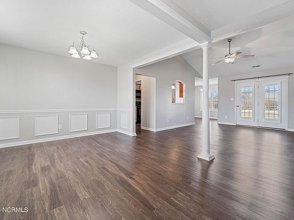 Located in the tranquil Killis Hills neighborhood of Richlands, North Carolina, 405 Silva Cove offers a serene living environment just minutes from local amenities. The residence boasts an open, split-bedroom floor plan, providing both privacy and a sense of spaciousness. Freshly painted interiors are complemented by new carpeting and luxury vinyl plank flooring throughout, enhancing the home's modern appeal. Built-in plantation shutters add a touch of elegance to each room. The well-appointed kitchen includes stainless steel appliances, ample cabinetry, and a convenient breakfast nook. Adjacent to the kitchen, the living area features a cozy fireplace, creating a welcoming atmosphere for relaxation and entertainment. Situated on a 0.43-acre lot, the property offers a private backyard, ideal for outdoor activities and gatherings. The attached one-car garage provides additional storage space and convenience. The home is located on a quiet cul-de-sac, ensuring minimal traffic and a peaceful setting. Residents of Killis Hills enjoy a close-knit community atmosphere with easy access to shopping centers, and recreational facilities. The neighborhood's proximity to major highways facilitates convenient commuting to nearby cities and military bases. This well-maintained home at 405 Silva Cove presents an excellent opportunity for those seeking comfort and convenience in Richlands. Its modern amenities, spacious layout, and prime location make it a standout choice for prospective homeowners.