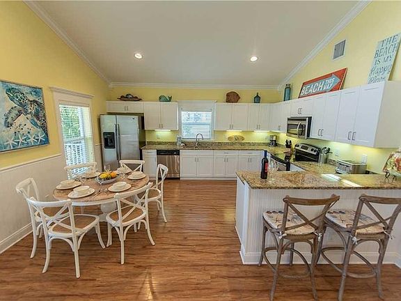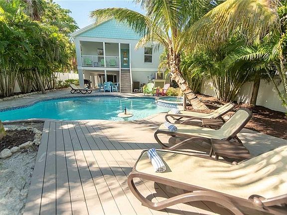 Bahama Breeze!! A recently renovated 4 bedroom-3 bathroom home underwent an exterior beautification project in Fall 2018 with new coastal exterior paint, hardie board siding and hand-placed shell. New paved recreation area underneath the house and large Azek wood deck for optimal sun-bathing. The home has 3 King bedrooms and 1 bedroom with full size bunk beds with a new large luxury tropical pool and spa, nestled in the prestigious North end of the beautiful Anna Maria Island. With just a short walk away to all of the fabulous amenities that Pine Avenue has to offer and just a quick 5 minute stroll to either the Gulf or Bay beaches. The Over-sized lot makes for a large backyard and pool living area for your enjoyment. On the ground level under the elevated house is a recreational area.
