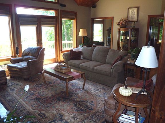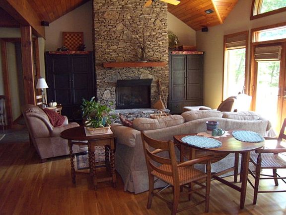STUNNING HOME with main level living, hard wood floors, FABULOUS VIEWS (about 160 degrees on 2 floors), and only 5 minutes from New Market Center! Inside, the stacked stone fireplace and vaulted wood ceiling are only surpassed by the beautiful windows and doors looking out on the deck, trees and mountains beyond. There are huge natural rock steps amidst the plants at the sitting area out front which make it possible to get to the basement or lower driveway outside quickly from the entry of the house.