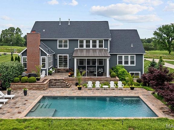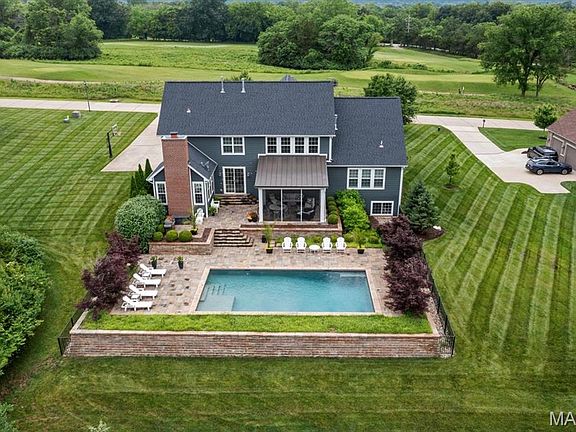 Welcome to luxury living in the highly sought-after, gated Pevely Farms community! This custom-built home sits in a premier location with views of the 9th hole's tee box from the front yard and the property itself backing directly to the 13th hole. It's the perfect blend of privacy and picturesque golf course living- a dream for golf lovers. Step inside to an open-concept layout featuring a stunning kitchen with a one-of-a-kind sapele mahogany wood island- ideal for entertaining. The living room boasts custom built-ins and a gas-burning fireplace, while a cozy hearth room just off the kitchen offers a second fireplace- perfect for relaxed evenings or morning coffee. The spacious main-level primary suite includes a spa-like bath and a beautifully designed custom closet. Outside, unwind in your private backyard oasis with a gunite pool, paver patio, and covered screened porch- perfect for summer gatherings. This quiet neighborhood offers upscale living with the beauty of nature and the bonus of golf course access. Homes like this in Pevely Farms don’t come around often!