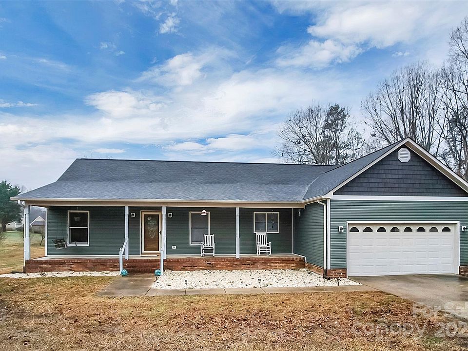 Discover this beautifully updated 3-bedroom, 2-bathroom home that combines comfort and functionality. Nestled on a spacious lot in Kings Mountain, the property welcomes you with a rocking chair front porch, perfect for relaxing mornings. Inside, the split bedroom layout ensures privacy, while the spacious living room boasts a vaulted ceiling and cozy fireplace. The kitchen shines with granite countertops, stainless steel appliances (range, microwave, and dishwasher), and a charming coffee nook. Enjoy meals in the adjacent dining room, and tackle chores easily in the laundry room. The primary suite is a retreat with a dual vanity, freestanding tub, shower, and a walk-in closet. Walk out onto the large back deck—complete with an outdoor bathroom—overlooking a generous backyard with a storage building and an impressive 24' x 26' workshop featuring a 12' x 26' covered lean-to and 200-amp service. A 2-car garage and brand-new siding with warranty complete the package. Don’t miss this home!