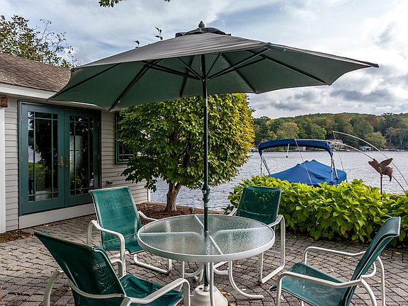 Highland Lake, a 444 acre body of water noted as one of the cleanest lakes in Connecticut. This year round one owner home has also been renovated with quality materials and finishes over the last few years. Stunning views from a newer Trex wrap around deck which overlooks a beautifully landscaped property and includes a spacious private waterfront with 115 feet, beach for launching your kyak or boat, a dock, entertaining area with patio and a cabana housing a bathroom, refrigerator and storage. A contemporary post and beam home with an Adirondack feeling in this open floor plan featuring a stone fireplace, vaulted ceiling and great floors and flows into the spacious dining area with access to the deck. Updated chef's kitchen has a 5 burner gas cook top, center island, pot rack and granite counters. An en suite first floor master bedroom and beautifully appointed bath with private deck. The second level bedroom has a full bath and office area. The finished walk out lower level (450+/- sq.ft) with 1/2 bath can be a third bedroom or game room and has lake views. The attached garage is deep and wide for cars with work area. CertainTeed siding, newer solar skylights, doors, 2017 roof and converted to propane heat. A generator is also included, lighting is built into stone walls, electric and water in the cabana and concrete sea wall. Buyers to assume balance of sewer assessment, approx. $2,900. Enjoy your summers or year round living at this most desirable lake.