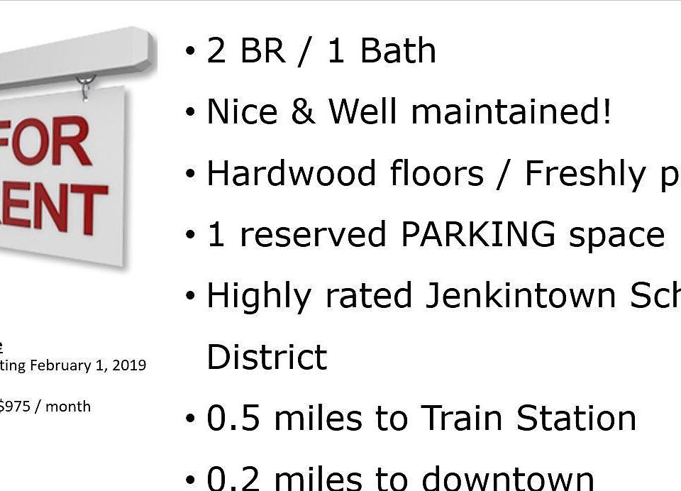 2 Bedroom/1 Bathroom Apartment - Nice & Well Maintained! $950 per month (see utilities below) - Forced gas heat + hot water is an additional flat $50/per month - Water is an additional $35 per tenant - Electricity is not included and is billed directly through PECO *NOTE: This property was recently purchased and is under new management (additional amenities including shared laundry and apartment upgrades are planned). This unit is currently being cleaned & updated. The unit is currently tenant occupied and will require 24 hours notice for showings. Make sure you watch the walk-through video in the link below! This 2 bedroom, 1 bathroom, 600 square foot apartment is a well-maintained top-floor unit on a quiet residential block in the Jenkintown Borough. See a video walkthrough here: LOCATED NEAR: - 0.5 miles from train station (Jenkintown) on the Glenside and Lansdale/Doylestown line - 0.2 miles to downtown shopping, restaurants and bars (HiWay Theater, Neshaminy Creek Brewery, The Drake Tavern, Buckets, West Avenue Grill & more!) - a great walk during the Spring, Summer, and Fall Months! - Within 2 miles of Trader Joe s, Whole Foods and Acme - Within 2 miles of Planet Fitness, LA Fitness and Philadelphia Rock Gym - Within walking distance to multiple parks, baseball fields, skate park, pools, and playgrounds - 2.2 miles from Arcadia University - 2.1 miles to Penn State Abington - Centrally located - 30 minutes from Center City Philadelphia; 20 minutes from King of Prussia - Located in award-winning Jenkintown School District HIGHLIGHTS: - Private off-street parking for 1 car - Well-maintained - Very clean - Hardwood floors throughout (vinyl tile in kitchen and bathroom) - Closet space - Dedicated unsecured storage area in the basement included in rent - Pet-friendly (see "REQUIREMENTS" section below for more information) FREQUENTLY ASKED QUESTIONS: - Available starting February 1, 2019 - Lease Term: 1+ year - Type of heat - forced gas - Type of cooling - Window A/C unit(s) available for use if available, but not included in lease; otherwise provided by tenant - Water bill - included in the rent. Additional $35 for each tenant after the 1st (subject to adjustment if actual bills significantly exceed the allowance) - Average monthly electric bill - varies based on usage - Appliances included - Refrigerator, oven, stove. - Some responsibilities of tenant - electric; snow removal from cars and driveway - Some responsibilities of landlord - snow removal from sidewalks along street; lawn maintenance REQUIREMENTS: - Rent is $975 per month plus utilities - First month, last month, and one month security deposit required up front ($2925) - Background and credit checks required - Credit score of at least 600+ - Non-smokers only - No prior evictions - No criminal history - Verifiable employment income of $2925 per month or more among all applicants - 2 year work history at same job or same field of work - Pets allowed (subject to pet screening + additional $25 rent per pet per month + $350 non-refundable pet fee + refundable additional security deposit of $350) - Renter's insurance required with landlord listed as Additional Insured - All applicants over the age of 18+ are required to fill out an application along with a $35 non-refundable application fee. - Recurring online monthly rent payments required (at no additional cost to tenant); bank account required Currently available for showing Monday-Friday between 9 am and 3 pm, or on weekend mornings beginning between 10 am and 12 pm. If you have questions that were not answered in this listing, please send us an email. If you have no specific questions, please fill out our Pre-Showing Questionnaire at this link to schedule a showing: http tinyurl.com/propertyrental Thank you!