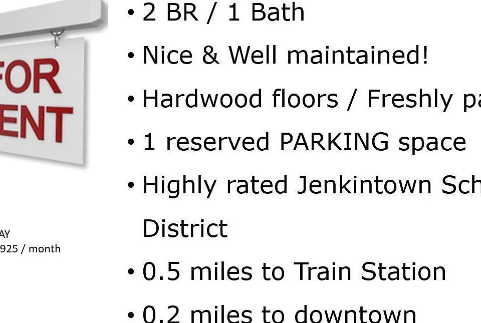 2 Bedroom/1 Bathroom Apartment - Nice & Well Maintained! $925 per month (see utilities below) - Forced gas heat + hot water is an additional flat $50/per month - Water is an additional $35 per tenant - Electricity is not included and is billed directly through PECO *NOTE: This property was recently purchased and is under new management (additional amenities including shared laundry and apartment upgrades are planned). This unit is currently being cleaned & updated. The unit is currently tenant occupied and will require 24 hours notice for showings. Make sure you watch the walk-through video in the link below! This 2 bedroom, 1 bathroom, 600 square foot apartment is a well-maintained top-floor unit on a quiet residential block in the Jenkintown Borough. See a video walkthrough here: LOCATED NEAR: - 0.5 miles from train station (Jenkintown) on the Glenside and Lansdale/Doylestown line - 0.2 miles to downtown shopping, restaurants and bars (HiWay Theater, Neshaminy Creek Brewery, The Drake Tavern, Buckets, West Avenue Grill & more!) - a great walk during the Spring, Summer, and Fall Months! - Within 2 miles of Trader Joe s, Whole Foods and Acme - Within 2 miles of Planet Fitness, LA Fitness and Philadelphia Rock Gym - Within walking distance to multiple parks, baseball fields, skate park, pools, and playgrounds - 2.2 miles from Arcadia University - 2.1 miles to Penn State Abington - Centrally located - 30 minutes from Center City Philadelphia; 20 minutes from King of Prussia - Located in award-winning Jenkintown School District HIGHLIGHTS: - Private off-street parking for 1 car - Well-maintained - Very clean - Hardwood floors throughout (vinyl tile in kitchen and bathroom) - Closet space - Dedicated unsecured storage area in the basement included in rent - Pet-friendly (see "REQUIREMENTS" section below for more information) FREQUENTLY ASKED QUESTIONS: - Available starting February 1, 2019 - Lease Term: 1+ year - Type of heat - forced gas - Type of cooling - Window A/C unit(s) available for use if available, but not included in lease; otherwise provided by tenant - Water bill - included in the rent. Additional $35 for each tenant after the 1st (subject to adjustment if actual bills significantly exceed the allowance) - Average monthly electric bill - varies based on usage - Appliances included - Refrigerator, oven, stove. - Some responsibilities of tenant - electric; snow removal from cars and driveway - Some responsibilities of landlord - snow removal from sidewalks along street; lawn maintenance REQUIREMENTS: - Rent is $925 per month plus utilities - First month, last month, and one month security deposit required up front ($2775) - Background and credit checks required - Credit score of at least 600+ - Non-smokers only - No prior evictions - No criminal history - Verifiable employment income of $2850 per month or more among all applicants - 2 year work history at same job or same field of work - Pets allowed (subject to pet screening + additional $25 rent per pet per month + $350 non-refundable pet fee + refundable additional security deposit of $ - Renter's insurance required with landlord listed as Additional Insured - All applicants over the age of 18+ are required to fill out an application along with a $35 non-refundable application fee. - Recurring online monthly rent payments required (at no additional cost to tenant); bank account required Currently available for showing Monday-Friday between 9 am and 3 pm, or on weekend mornings beginning between 10 am and 12 pm. If you have questions that were not answered in this listing, please send us an email. If you have no specific questions, please fill out our Pre-Showing Questionnaire at this link to schedule a showing: http tinyurl.com/propertyrental Thank you! Owner pays for gas and water. Tenant is responsible for electric.
