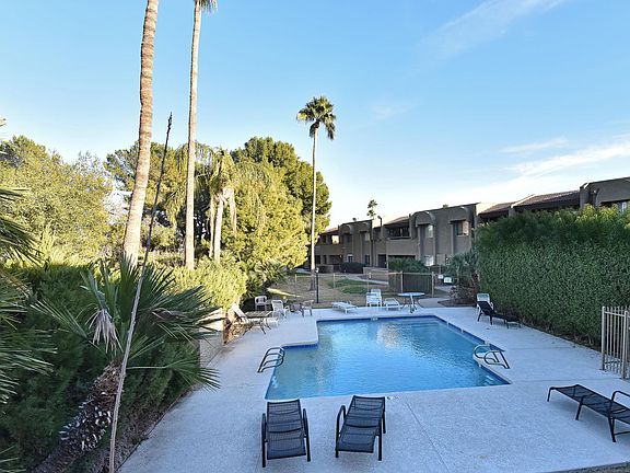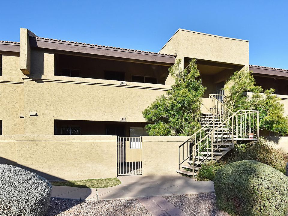 LOCATION! LOCATION! LOCATION! Move-In Ready! Beautifully updated: 2019 new tile floors, vanity in 1/2 bath, master vanity counter, interior paint. Carpet in 2017. Stove & dishwasher in 2015, fridge in 2018. Stack washer 2012. Relax on the balcony overlooking the greenbelt. The kitchen opens to a breakfast bar and spacious living/dining room. You'll appreciate the ample storage space inside & closet on the front deck. Ceiling fans. Rich oak floor in the 2nd bedroom. The sparkling community pool is the perfect place to catch a tan and cool off. This location offers easy access to shopping, restaurants, theaters, downtown Phoenix, Sky Harbor airport, Desert Ridge, Kierland, golf courses & more. PLEASE NOTE: curtains do NOT convey. Great full time living or Lock & Leave winter home.