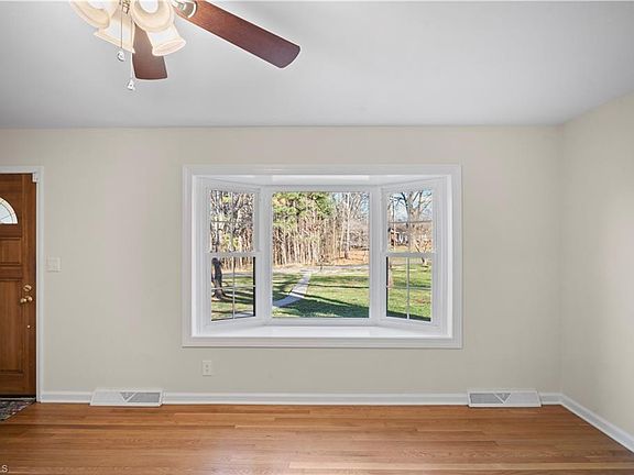 **OFFER DEADLINE 3pm 3/25/25** Step into this charming brick ranch with vintage charm at end of road with almost 2 acres of adorable view! Nestled in a well-established neighborhood, this well maintained single story home offer a spacious and functional layout. Ample natural light floods into the living room and sunroom. Hardwood floors throughout living and bedrooms. Kitchen with loads of cabinet storage, tiled floors, tiled backsplash, and dining! Basement offers den with cozy gas fireplace, another full bath, laundry and storage room. Quaint outdoor area with deck for entertaining, a creek with wooden bridge straight out of a storybook, and just under 2 acres of land for all of your gardening and play desires. With easy access to Winston Salem and Kernersville, amenities are minutes away. Transform this brick house into your new home with your own personal touches! NEW PAINT! Freshly REFINISHED HARDWOODS! One year home warranty with acceptable offer!