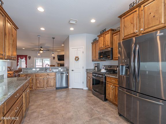 Looks and feels brand new. This very well maintained home shows pride of ownership!In the desired unit 20 of Prescott Valley, this 3 bedroom, 2 bath has a large beautiful kitchen with Knotty Birch Rustic Tuscany Cabinets, Black stainless steel appliances (Frigadaire Galary pkg) still under warranty. 13 ft ceiling in foyer, Granite counter tops and 18 in tile through out the home. Gas fireplace w/stone surround in living area. Main bedroom acsess to fully covered and screened in back patio,walk in tile shower, Garden tub, double vanities, large walk in closet. 30x60 approx. side yard for RV, boat, toys etc. w/shed totally fenced. New 3 car garage doors end of 2021 with keypad entry. Great curb appeal. A must to see! OPEN HOUSE Saturday Feb 4th 1-4