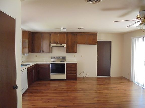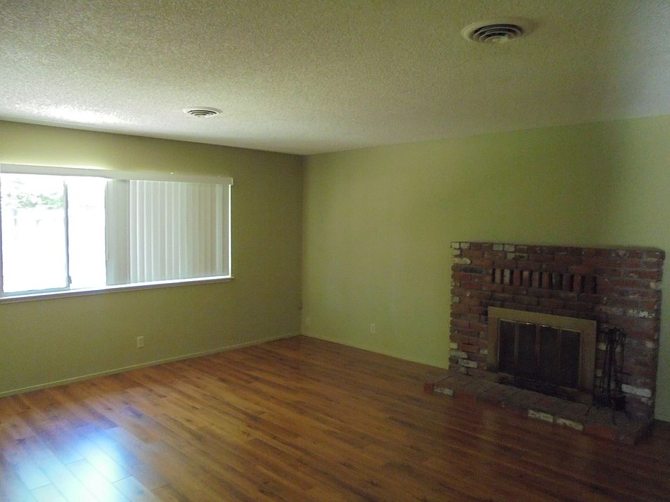 Tile countertops, hardwood flooring (carpet in bedrooms), across from park, nice mature neighborhood, patio, wood burning fire place