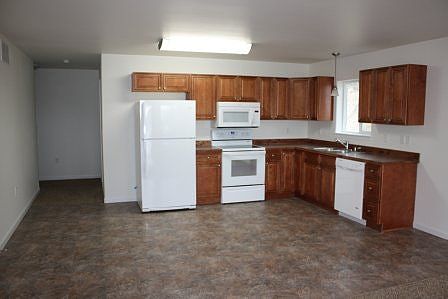 Kitchen features, electric stove, refrigerator, dishwasher and over the range microwave. Master suite with two full sized closets and on suite full bath. Open kitchen, dining, living room floor plan. One car garage. Energy efficient on demand heating system and in floor radiant heat. House shares driveway with three other houses. Washer and Dryer provided. Pets on approval, No smoking in home. Water, sewer, trash included in rent. Owner pays water, septic, trash. Tenant Pays gas and electric.