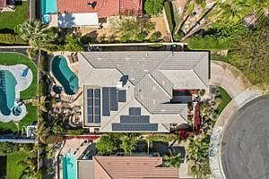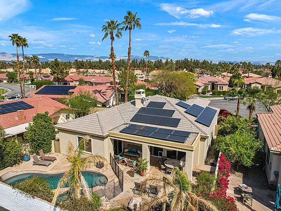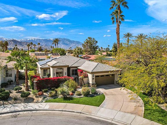 Beautiful 3 bedroom, 2.5 bath house in Central Palm Desert location-walking distance to restaurants and grocery stores.Located at the end of the cul-de-sac on a quiet street with stunning landscaping. No need to worry about electric bills with your fully owned solar system. Enter the updated kitchen with oversized granite island, built-in wine fridge, 5-burner gas range and newer fridge and dishwasher. The spacious open floor plan flows into the living space with updated stone fireplace, bar, and built-in speakers for all your entertainment needs. Large glass sliders lead out to the west-facing backyard where desert sunsets and view of San Jacinto take center stage. The salt water pool and hot tub, gas fire pit, built-in grill, and outdoor furniture included, make this space ready to provide many days of relaxation. The bonus courtyard has planter boxes ready for your vebetable garden. The spacious primary suite has an oversized walk-in closet as well as a secondary closet and built-in office area. The en suite bathroom has dual sinks, a large shower and a separate tub. The 2nd and 3rd bedrooms offer plenty of space for family or guests. the two car garage also includes overhead and built-in storage spaces. The house really has everything needed to immediately move in and start enjoying the desert lifestyle.