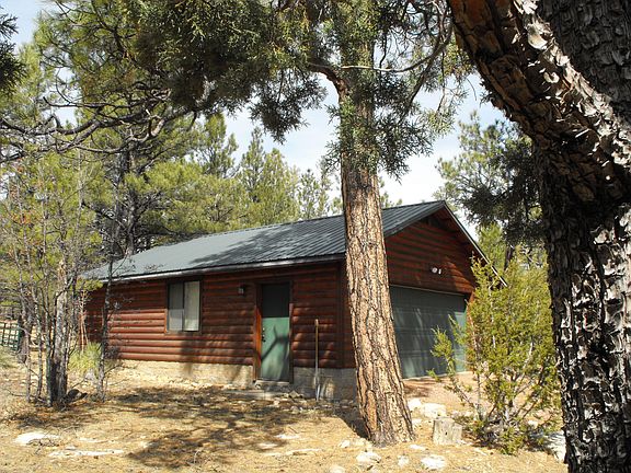This is truly a LOG CABIN with green metal roof in the tall Pines, bordering National Forest!!! It is on 2 separate lots that will only be sold together, so you have 2.11 acres of privacy. Just what you've dreamed of. Easy access in the back through the kitchen, or up stairs to the front door. Open Greatroom with pine plank floors, chalet windows, wood beams. Rock fireplace opening has a propane stove in it with thermostat. 2 Bedrooms and 2 Baths on the main floor, then up to a spacious loft for bunks or family room. Hot tub is out on the deck outside of the Master suite. Oversized 2 car garage for 2 vehicles plus your forest toys. (Corral fencing is not included). Don't miss out!!!
