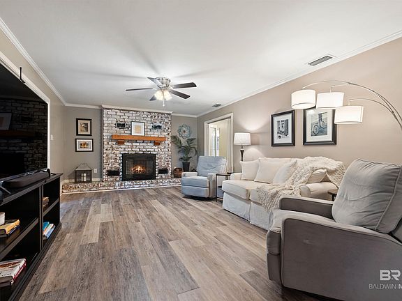 Welcome to this stunning 2,297 sq ft all-brick home featuring a 33'x16' heated and cooled enclosed sunroom, perfect for year-round entertaining and enjoyment. Inside, you'll find a blend of tile, wood, laminate, and carpet flooring, complemented by extra storage closets throughout the house.The kitchen is a chef's dream with granite countertops, stainless steel appliances, and a refrigerator with filtered ice and water in the door that conveys with the property. Featuring a smooth top cooktop and new countertop microwave, while a wall oven, and dishwasher were installed in 2024. Wait till you see the extra large windows over the sink! The separate laundry room and pantry offer added convenience.This home boasts an open-concept dining and living room, anchored by a large, beautiful, wood-burning brick fireplace. Beveled glass folding doors elegantly separate the living room from the breakfast room, enhancing the home's charm.The primary bedroom is a true retreat with three closets, and en suite full bathroom. Smooth ceilings, and crown molding throughout. The home also includes a 2021 tankless water heater, ensuring endless hot water. Outside, the two-car carport comes with a large bonus storage room or workshop.Practical features include gutters with leaf guards, ensuring low maintenance. Yard boasts many beautiful azaleas, camellia bushes a tangerine tree, sagos and shade trees. Situated in a community known for its golf cart parades, food trucks, and convenient boat launch. It's also conveniently located near the interstate, shopping, and restaurants. Don't miss the opportunity to own this beautiful, well-maintained home. Schedule your showing today!'All measurements, square footage and all pertinent information to be verified by buyer and/or buyer's agent. Buyer to verify all information dur Buyer Buyer to verify all information during due diligence.