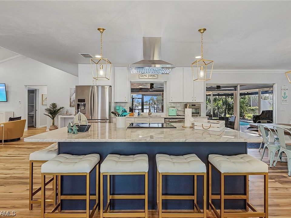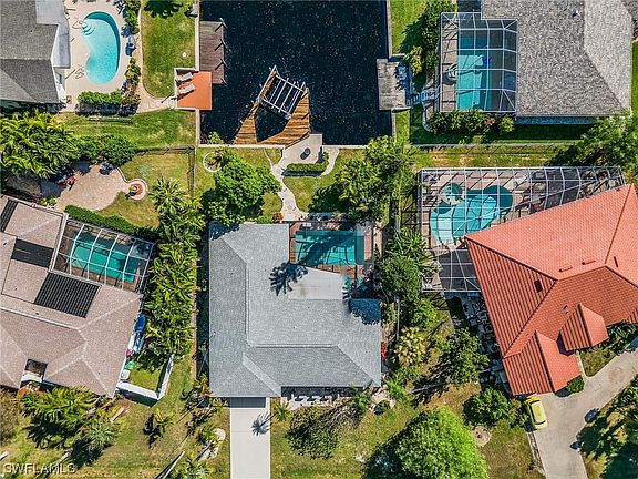 This gorgeous and modern, fully remodeled GULF ACCESS Waterfront heated pool home offers the perfect Florida Lifestyle! The sellers are also offering the full Turnkey package outside of the home purchase making this home 100% ready to go! Upon entrance, you'll be amazed by the level of detail in the trendy decor and beautiful finishes. The fully open living / dining / kitchen / and vaulted ceiling great room makes this a perfect oasis for entertaining or sharing a relaxing evening with family or friends. You'll then be swept away with the view of the saltwater canal which stretches almost 1,000 feet looking down the waterway! The kitchen is a cooks dream with beautiful white/grey quartz countertops, two tone white and blue cabinets, soft close drawers, gold color hardware and light fixtures, spacious island with seating, and a full set of matching stainless steel appliances. This home truly is a must see! Enjoy piece of mind with a NEW ROOF in 2023, impact windows, and electric shutters which close off the lanai space when needed. This home has the option for a very low flood insurance rate with a transferrable flood policy currently at $928 per year. Plus, the property did not flood during Ian. For Boaters, life is good with a captains walk dock, 12,500 lb boat lift, and just a short 15 minute cruise to the river with scenic views via the 200' wide Rubican & Plato canals. The split floor plan features a luxurious master suite with a gorgeous bathroom and luxe tile shower! You can also stream music through the Bluetooth exhaust fan light with speaker : ) The other guest side of the home has another 3 full bedrooms, one being a smaller room with bunk beds making it perfect for an AIRBNB vacation rental or large family. The optional turnkey package gives you everything you need to start your investment on day one! The bedrooms and living areas are designed with an amazing blend of both modern luxury and mid century modern aesthetic attributes. Throughout the house, you have 4 sets of sliding glass doors that offer natural light and access to the pool for fresh air by opening the house on those 70 degree winter days and enjoying the blended indoor / outdoor lifestyle afforded by your pool cage with upgraded panoramic screens. Don't forget, you can enjoy the pool and beautiful landscaping all year long with the electric pool heater and full property automatic irrigation system keeping everything green and blooming well. While out back, you'll love the mature mango and avocado trees in the yard! Being conveniently located close to downtown Cape Coral, the new Bimini basin project, the Yacht Club beach, Ft Myers bridge, and many shopping and dining options, this home offers the perfect location and space for entertaining and gathering with friends and family! Call today for your private showing and more info!