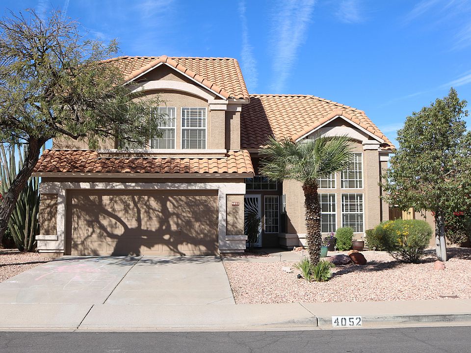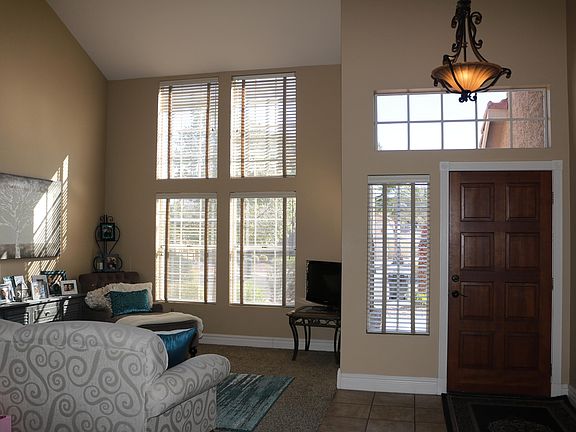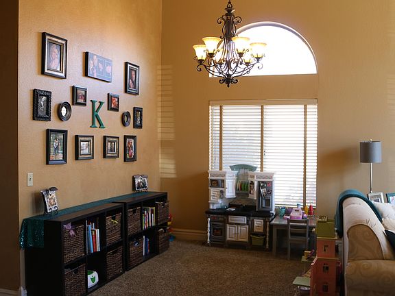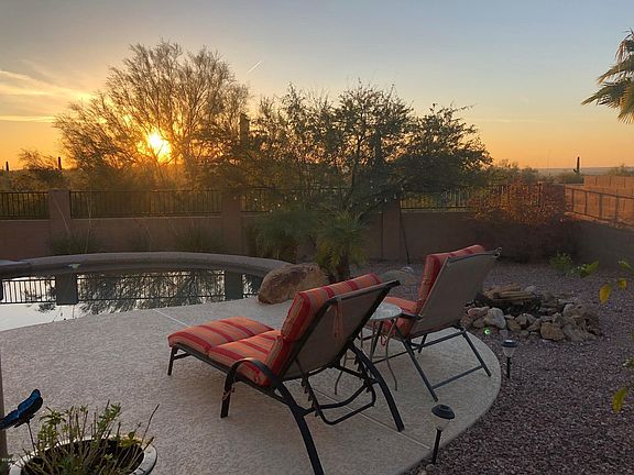 Beautiful sunsets and mountain views, from this 4 bedroom, 2 1/2 bath, vaulted ceilings, partially remodeled home. Newer stainless steel appliances, granite counters throughout, master bedroom downstairs includes walk-in closet, and patio doors with views of large pool. Three bedrooms upstairs, and full bath with granite countertop and double sinks. The backyard has a beautiful pebble tec pool, covered patio with play area, view fence for gazing at miles of desert views. New AC in 2014, new pool pump in 2017, and many other updated and replaced items. The home is move in ready. The chandelier in 3rd bedroom does not convey.