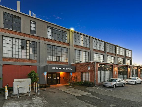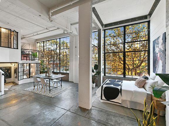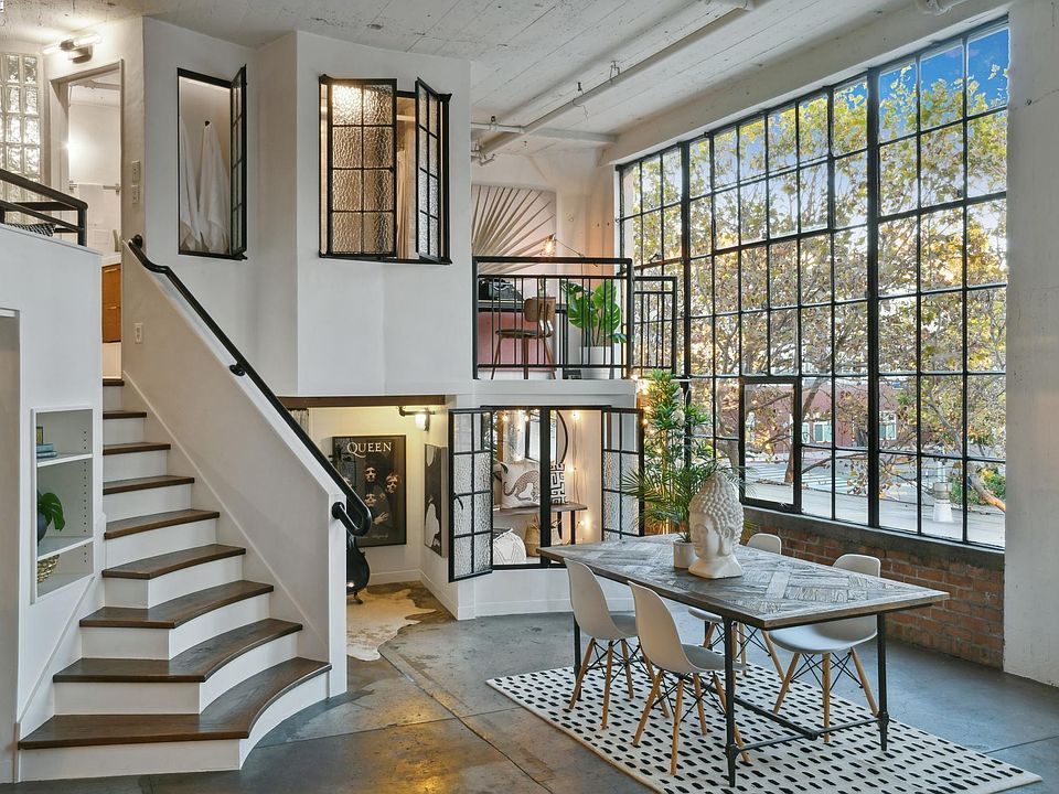 Live in fabulous urban comfort and convenience in this upgraded loft studio in the historic Besler Building. The 1145 SQFT loft with generous sleeping area and 1 full bathroom exudes industrial chic, boasting cathedral ceilings and a giant wall of 14 foot high Bauhaus style windows. Sunlight streams into the expansive, flexible space where the lower level offers plenty of room to live, dine, entertain, work, and sleep in different areas. A huge fluted concrete column provides an artistic focal point, and built-in shelving adds display and storage possibilities. Underneath the large loft, you’ll find an adorable glass enclosed nook, laundry area, and tons of room for storage or other uses. Up a striking staircase, a gorgeous eat-in kitchen, complete with top-of-the line stylish appliances and built-in seating, offers a great place to enjoy a meal with friends or relax with your morning coffee. Also upstairs is a renovated full bath and a sunny space to work. One parking permit for the lot is included. Explore Emeryville’s growing creative/tech nexus and the neighboring Pixar campus, plus every modern convenience including shopping, dining & the movies. Commuting is easy via express bus to SF that stops right outside, nearby BART, Amtrak, or quick access freeways.