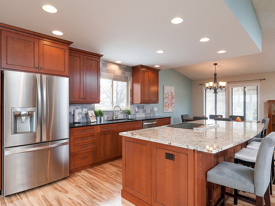- Eating Space / Kitchen, Open Floor Plan, Kitchen Island, Master Bath, Master Suite, Window Coverings, Remodeled