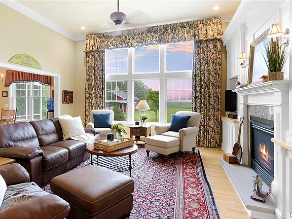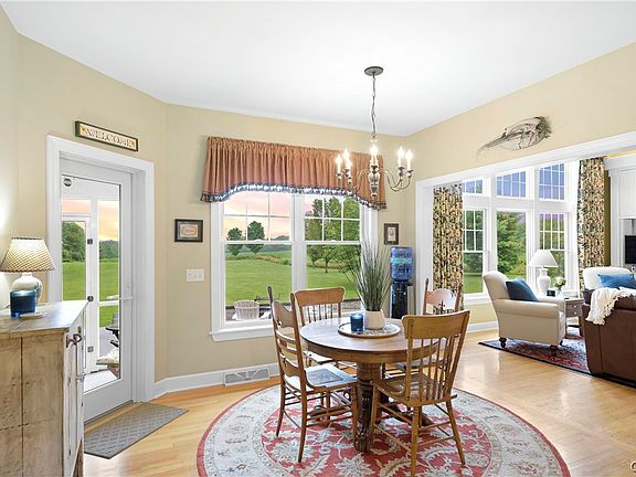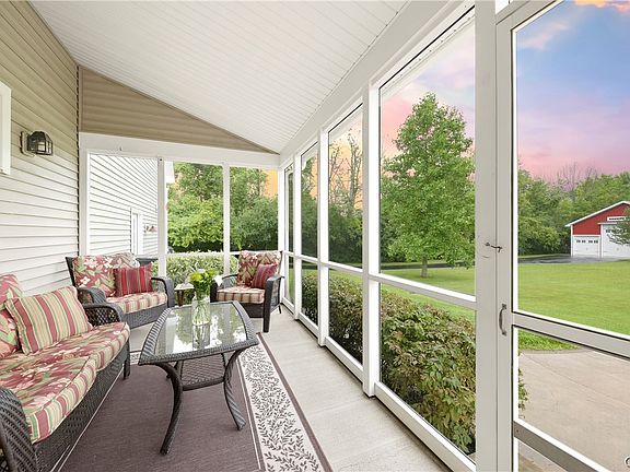Immaculate four bedroom Cape Cod nestled on over three acres of land only two miles from the village center. Offers a great floor plan, vaulted ceilings on the main living area and an abundance of windows overlooking the manicured yard. Formal dining with custom coffered ceilings, hardwoods, eat-in kitchen with custom cabinets, granite counters, island and breakfast room, with door that leads to screened in porch, 1st floor laundry, half bath, and office. Primary bedroom and bath on first level, oversized jet tub, tiled shower, double vanity and walk-in primary closet. Second level offers 2 ample sized bedrooms with private vanity and jack and Jill bath with tub/shower. Bonus room over the garage with vaulted ceilings great extra living space. Partially finished lower level has egress windows, bedroom with new bath and tiled shower and single vanity, living room area with gas wood stove, game room area with pool tables and a bar area with cabinets and sink, and tons of unfinished space for storage. Grounds are manicured with mature lush landscaping, large back patio over the picturesque backyard, and a large barn great for storing large items. Award winning Skaneateles Schools.