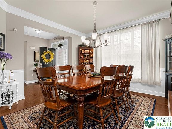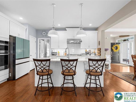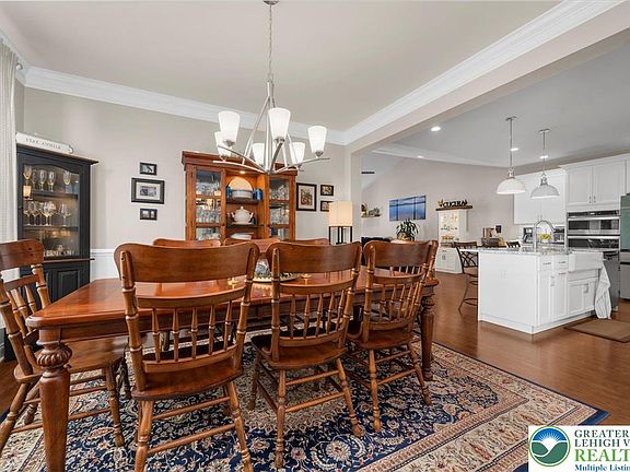 Welcome to this elegantly upgraded 3-bedroom, 2-bath home, built in 2020 and ideally located in the prestigious 55+ community of Regency at South Whitehall. Just minutes from major highways—476, 309, 22, and 78—plus Lehigh Valley Hospital and Airport, this home blends sophistication, comfort, and convenience. With over $100,000 in upgrades, including a beautifully finished basement, every detail is designed to impress. The gourmet kitchen features granite countertops, a large island with pendant lights, 42” cabinets, stainless steel appliances, a gas stove, oven microwave combo, and gleaming hardwood-style floors. The adjacent formal dining room offers hardwood floors and a tray ceiling—ideal for entertaining. The living room features soaring ceilings, a cozy gas fireplace, and opens to a private patio with retractable awning for enjoying sunset views. The primary suite includes a tray ceiling, walk-in closet, and a spa-like en-suite. A second bedroom with tall windows, an additional full bath, and a laundry room with garage access complete the main level. The finished basement offers a spacious recreation area, a custom Lori wall bed, a bonus room for guests or an office, a large storage area, and a workshop. Sliding glass doors lead to a beautiful paver patio, extending the living space.