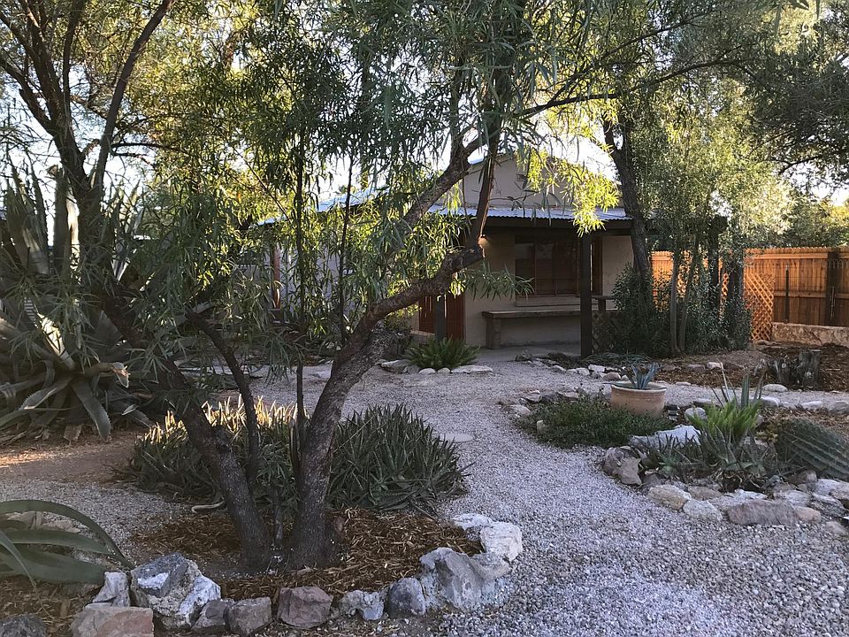 Super quiet, private, cozy cottage walking distance to Randolph Golf Course and Reid Park trail. Birds, lizards, and native plants abound. Full kitchen with open shelves and gas stove. Tile in living room, kitchen, and bath, carpet in the bedroom. House is set back from the road with a wide front porch for relaxing while enjoying your morning coffee. Shared washer/dryer/patio with Dreaming Tree cottage on the same lot. Close to University, Medical Center, Baseball Stadium, Zoo, and more. Dreaming Tree cottage is also available at the moment... inquire for photos. Same price, same square footage but with a slightly different layout, and 3/4 bath rather than full bath. Owner pays for trash and sewer. Tenant pays for gas and electric, including electric for shared washer.