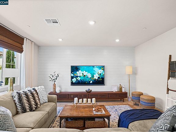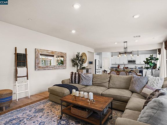Built in 2020, this contemporary, 4-bedroom, 3-bathroom home has been upgraded with modern elegance and energy efficiency. Situated in a gated community, it features owned solar and a convenient main-level bedroom and bathroom. The centerpiece of this home is the expansive great room, which features an open concept kitchen, living area, and dining space. The kitchen is a chef’s dream, cafe appliances including a gas range, sleek cabinetry, an island that seats four, and a spacious pantry. This area effortlessly transitions into the large living room, ideal for gatherings, complemented by beautiful LVP flooring. Upstairs, you'll find a versatile flex space ideal for a family room, exercise area, or home office. The primary suite is a serene retreat, boasting an ensuite bath with a separate tub and shower, dual sinks, and a large walk-in closet. The additional bedrooms are well-appointed and share a guest bath with a shower over tub. Step outside to find a spacious yard with a stylish paved patio, lush lawn, and an inviting hot tub. Additional features include plantation shutters and recessed lighting throughout. Located within walking distance to Orchard Park K-8 School and Holly Creek Park, and just minutes from shopping, eateries, Highway 4, and Antioch BART.