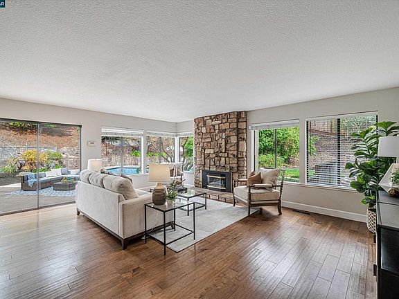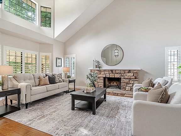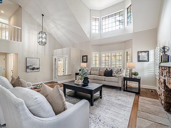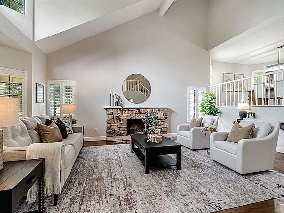 Open Sat & Sun 1-4. Welcome to your own private sanctuary nestled in the heart of Royal Ridge, a desirable neighborhood in San Ramon. This home offers 3547 ft.² of living space, thoughtfully designed w/5 bedrooms+private office, 3 renovated baths. Set on an expansive .54 acre lot this property harmoniously combines luxury & comfort. Upon entering, you are greeted by formal entry offering soaring ceilings opening to the adjacent living room w/wood floors, soaring ceilings, a wet bar & cozy fireplace. Gourmet kitchen is complete w/white shaker cabinets, quartzite slab counters, island, SS appliances & eat-in area w/built-in bench. Spacious family room w/fireplace & walls of windows showcasing the backyard & pool. Bed & full bath down! 3 upstairs bedrooms share the full bath complete w/new vanity, countertop, flooring & dual sinks. Double door entry leads to private primary suite w/connecting home office w/fireplace & views. Updated primary bath, complete w/travertine floors, newer cabinets, large soaking tub & stall shower. Beautiful & private backyard features sparkling pool & spa, patio area & views. What a fantastic space for entertaining family & friends, or simply relaxing! Fruit trees & space for gardening. Great location:close to SRVUSD schools, Iron Horse Trail, City Center