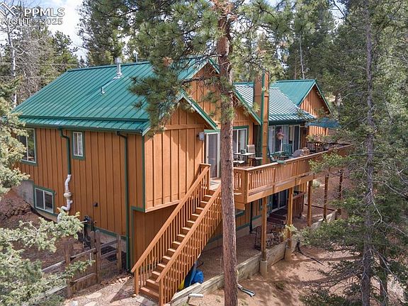Welcome to serene mountain living! Nestled within a wooded community, this charming four-bedroom, three-bathroom ranch-style home offers the perfect blend of natural beauty and modern amenities. Walking through the front door you’re greeted with a welcoming living area featuring a stunning stone fireplace allowing for a cozy yet luxurious feel. The family room flows into the dining area, which is a true extension of the home’s rustic elegance, creating an inviting atmosphere perfect for both everyday living and entertaining. The kitchen is an extension of the living area which creates an inviting, and functional space. The stainless appliances are not only practical but also elevate the aesthetic of the kitchen. The main level primary suite offers true indoor-outdoor living with access to a balcony perfect for quiet mornings offering a sense of connection with the land and the natural beauty of the trees. Each bedroom is designed for comfort and tranquility offering wooded views from every window highlighting frequent visits from deer, fox, and other forest animals. There's also a fully finished walk out basement. Your fenced backyard is a nature-filled retreat. A newer metal roof and water heater are excellent improvements to the home, allowing for maximum efficiency. This home boasts an oversized heated two-car garage with built-in workbench and storage shelves, allowing for ample space for projects, and storage. In addition an oversized garage, there is an extra wide driveway for RV parking which enhances the functionality and versatility of the one acre homesite. Whether you are relaxing on the expansive rear deck, exploring the wooded surroundings such as Pike National Forest Recreation Area, or enjoying the area lakes, this property promises a unique living experience. With private lakes nearby for fishing, kayaking, or enjoying events at the community pavilion. Located less than 4 miles to area conveniences. you get the best of both worlds. Welcome Home!