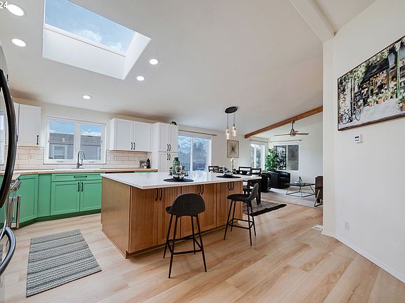 Welcome home to this newly remodeled sanctuary! This roomy 2 bedroom, 2 full bath home has been tastefully redone from floor to ceiling with over $80,000 invested! The interior boasts neutral paint, laminate flooring, plush carpet, painted kitchen cabinets, bathroom vanities and toilets, can lighting throughout, beautiful accent lighting, HUGE kitchen island with storage, quartz countertops throughout, high end kitchen appliances, and a nice walk - in shower in the primary suite. This home is tucked away in Songbrook Estates, one of Eugene's most desirable 55+park communities. This home is very light and bright, offering an open concept floor plan, with a large skylight in the kitchen. The primary suite is spacious, with private access to the backyard, his and hers closet spaces, and gorgeous farmhouse double vanity sinks,so no need to share your space! The kitchen is equipped with newly painted cabinets, a large skylight, and brand new laminate flooring throughout. The second bedroom could be used as a guest room or office/hobby room. Enjoy outdoor living on your fenced covered patio, with low maintenance landscaping. The clubhouse provides a hub of activities including: an indoor pool, hot tub, exercise room, card room, library, pool tables, a full-scale kitchen, and a spacious meeting room with a dance floor. Beautiful landscaping and a fenced dog park add to the community's charm. There's plenty to do! Don't miss out on this perfect opportunity! OPEN HOUSE this Saturday 3/2 from 11:00-1:00, and again Sunday 3/3 from 1:00-3:00.