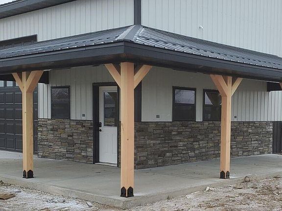 Property With New Shop Building For Sale - Cedar County, MOThe recently built (<2 years) 40x60 shop is extremely nice and was built by a local contractor. The shop is all electric with a 13x24 office/living quarters - 3/4 bathroom, plumbing for kitchen sink, water heater, and range hookup. The main part of the fully insulated shop has 14'9'' walls with three (3) 12x12 overhead doors with openers installed on all three. The office area could easily be made into a small living quarters. The partial wrap-around porch and the exterior finishings make for a very inviting place to set at any time.