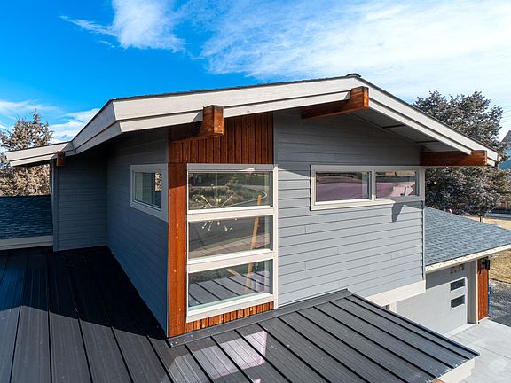 Gorgeous mid-century modern home with mountain view and custom features throughout. Open concept floor plan makes for easy living and entertaining. Amenities include surround sound, tank less water heater. gas fireplace with tile surround, central vacuum system. stainless steel appliances, built in wet bar with wine refrigerator and more. Main floor primary suite has a beautiful bathroom with heated floors, large tile shower and spacious walk-in closet. Private paver patio and an additional patio with hot tub. second floor has two bedrooms, full bathroom and flex space. Oversized two car tandem garage has plenty of space for your home gym or recreational toys.