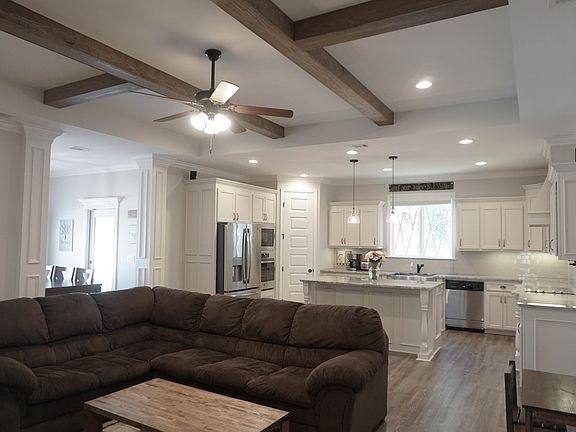 Built in 2018, located on 0.65 acre in cul-de-sac in single entrance subdivision. 3 car garage, privacy fenced, backs up to woods. Inside: white granite Kitchen with island open to Great Rm. Stained beams in Great Rm and Master Bedrm ceilings. LVP flooring in main living areas. Foyer entrance with coat closet. Kitchen: pantry, pot filler, wall mounted oven and microwave, French door refrigerator, under cabinet lighting. Barn door to Master Bathroom: double granite vanity, glass door tiled shower, walk-in closet, large soaking tub, private WC. Laundry: under cabinet lighting, clothes bar, built-in cabinetry. Guest Bath granite. Smart home install. Rose bushes, azalea bushes, kumquat fruit tree. Like new and very well cared for! Welcome home!