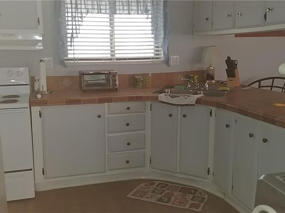 This open floor plan offers a total of 1,260 Sq ft, 3 bedrooms with 2 bathrooms, vinyl and carpet flooring throughout. The kitchen offers vaulted ceilings, tiled counter tops with breakfast bar, white cabinets and a window overlooking the property. The laundry room is a separate room that has a washer & gas dryer with white cabinets for storage above. This property is unique with a detached 3 car garage, covered front porch and covered back patio with an above ground pool .