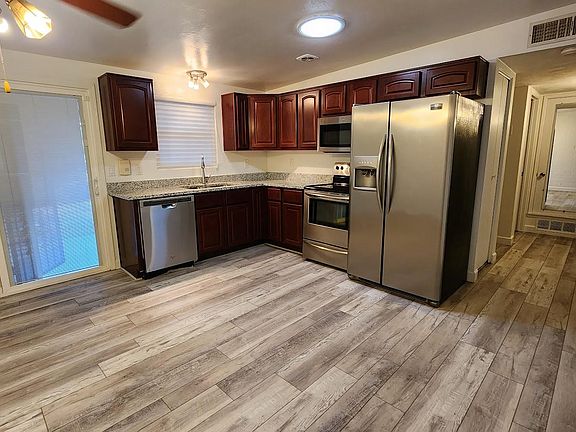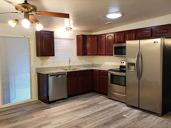 Completely remodeled and gorgeous! All appliances including washer and dryer. Private one-car, covered carport detached for ease of entry to your private well-manicured backyard. Covered patio and privacy fencing on one side and end unit on the other. Note: washer and dryer are as-is. Homes features include: new water heater, roof, A/C, wood-plank laminate flooring throughout, paint, granite counters, stainless steel appliances including electric flat-top range, microwave, refrigerator and dishwasher. Low E dual pane windows. Security bars. Pets upon approval. No cats. Renter is responsible for all utilities. No cats. Other pets upon approval. One year lease.