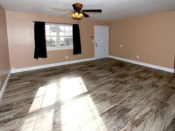 UPDATED! OPEN FLOOR PLAN! BACKS TO TREES! Enter to open concept main floor with living room open to the kitchen area--both with newer luxury vinyl plank wood-look flooring that continues down the hall and into the hall bath. Full bath has been updated with new vanity, toilet, and tub with tile surround. Wood-look laminate flooring in both bedrooms, both with ceiling fans. Updated 6" tall white baseboards have been added throughout the home except in 2nd bedroom. Attached 2-car garage is oversize with space for washer, dryer, and extra storage. 3rd garage door faces the back yard--great for storing mower and other lawn equipment.  New roof in 2021, along with new gutters & downspouts. Low maintenance vinyl siding + enclosed soffit and fascia. Entire yard is level and fenced. MUST SEE!