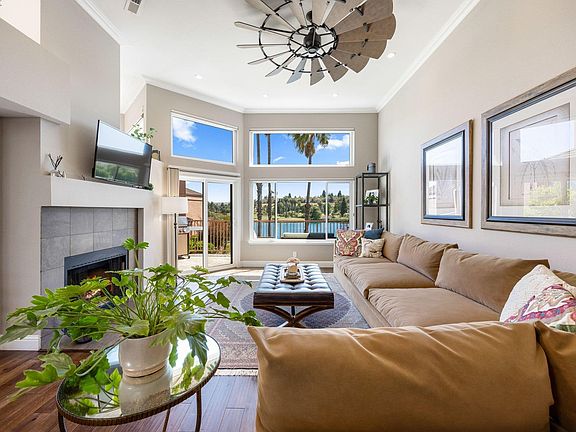 Stunning lakefront townhome at the prestigious Canyon Lakes. Primary suite on the main level provides a private sanctuary with wood and tile flooring, a walk-in closet, jet tub, and dual vanities. The main floor and living room feature soaring ceilings, multiple skylights, a cozy fireplace, and gorgeous views of the lake. Updated gourmet kitchen with stainless steel appliances, built-in oven/microwave, and 5-burner gas cooktop. Enjoy an evening BBQ with a lakeview sunset from the inviting balcony. Downstairs, a versatile family room provides for a peaceful retreat with direct access to the patio and lake, two bedrooms, a full bath, and laundry room with wash basin. Entertain guests with ease and step outside to embrace the true essence of waterfront living. Community amenities include four pools, tennis courts, and a basketball court.