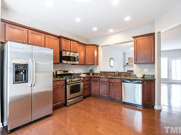 Fully upgraded END unit townhome with hardwoods, granite counters, SS apps, fans, trey ceilings, tile flooring & fresh paint. This bright & open home features a welcoming entry foyer, 2 master suites, gas log fireplace, a large rear entry garage & a private deck. Washer/Dryer & Refrigerator included! 3rd bedroom, office or bonus on the lower level has full bath. Walking distance to shops and restaurants, cul-de-sac street with extra parking & dog park in neighborhood. Outstanding prime Cary location!