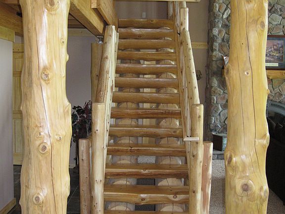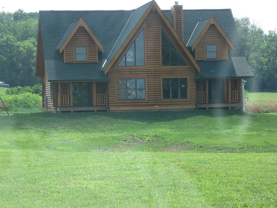 Vacation every day in this Log home on 6 acres w/stocked pond, 16 x 32 inground pool, geothermal heat/air, gourmet kitchen w/stainless steel appliances, 1st flr Primary Suite w/walkout to private covered deck, lst flr laundry, lst flr study/Bdrm, vaulted Great Room w/sunset views, all bedrooms w/walk-in closets, full basement, Pella windows, oversized 2 cars Garage & more.