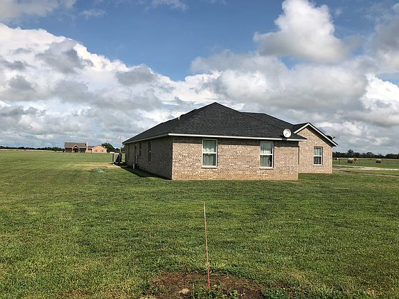 This beautiful home was built in 2014 and has tons of extras! With 4 bedrooms w/ an office, 2 bathrooms, a 2-car attached garage it is located on 5 acres w/ plenty of green grass. The home features stained and etched concrete floors throughout, a 4-ton 2-stage heat pump HVAC system with an upgraded allergen filtration system, blown in insulation, and attic over garage has been decked for additional storage space. The front door has glass side panels, insulated metal with glass & built in blinds on the back and side external doors and raised panel interior doors. Living room has a wood burning fireplace with built in blower, recessed lighting, ceiling fans throughout the entire home, modified pan ceilings in multiple rooms and dimmer switches in multiple rooms. Many large storage closets including some walk-ins throughout the home. The master bath has dual sink vanity, stool closet with upper cabinetry, dual shower heads and controls in the tiled shower/tub combo, and linen closet. Granite countertops throughout the entire home. Master walk-in closet has multiple built-ins and hanging racks. Kitchen has stainless steel appliances and corner pantry. Dining area has walk out door to patio/barbeque area. Utility/laundry room off hallway has folding counter, drying rack, upper cabinetry, freezer/fridge nook and storage cabinets. Garage has insulated overhead door, electric overhead garage door opener w/ external keypad, walk out door to patio, mechanical closet and drop stairs to the attic. Electrical upgrades include a whole-home surge protector and a 2nd dedicated electric panel pre-wired for an auxiliary emergency generator. The in-ground fiberglass storm shelter is located on the back patio.