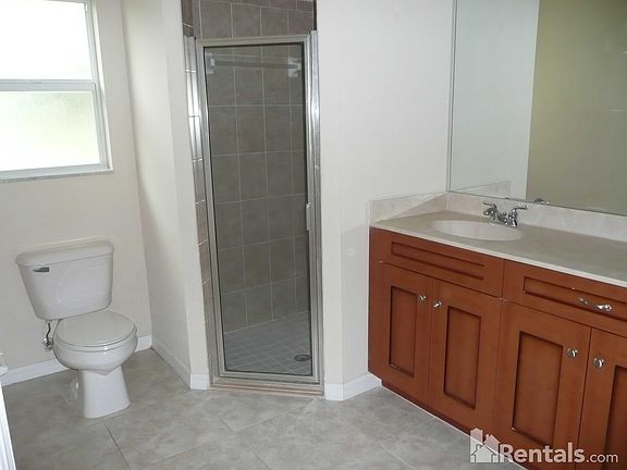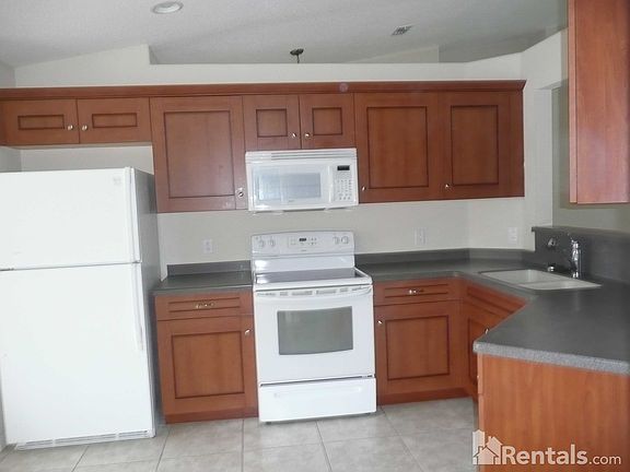 Ready move in June 17th. You will enjoy this Mediterranean style home with all the beautiful Wood Cabinets in all the Bathrooms and Kitchen. The kitchen has all like new appliances, built in Microwave, Dishwasher with cozy breakfast nook are, all complimented by the Cherry wood colored cabinets. Laundry room also doubles as a pantry for the kitchen for extra cabinet space. Three(3) bed rooms, 2 baths. Master bedroom has large walk-in closet with his and her vanities. Home is located at the end of a cul-de-sac. Also features large back yard with lots of privacy and screened in lanai patio and (2) car garage.