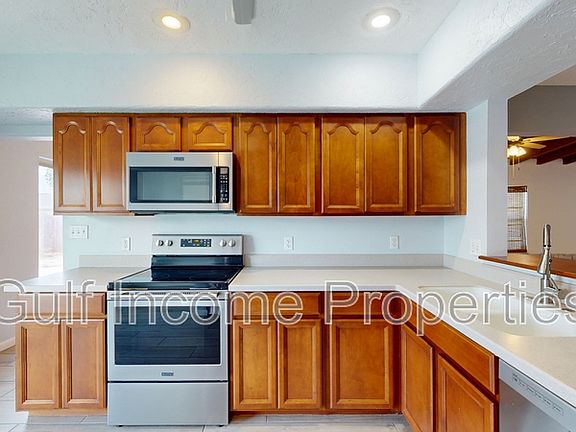 This spacious 3-bedroom, 2-bathroom home offers over 2,000 square feet of living space and is perfect for those seeking comfort and style. As you enter, you're greeted by tile flooring and a stone accent wall that adds warmth and character to the living area. The stone fireplace and vaulted ceilings create an open, airy feel complemented by abundant natural light throughout the home. The kitchen features hardwood cabinets, stainless steel appliances, and plenty of counter space for meal preparation. The home has been freshly painted, and the primary suite includes a private ensuite bathroom along with sliding glass doors that lead directly to the pool area.