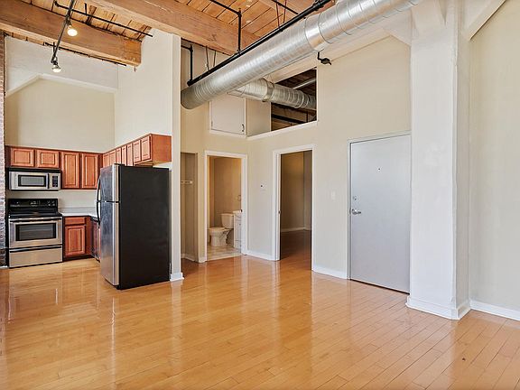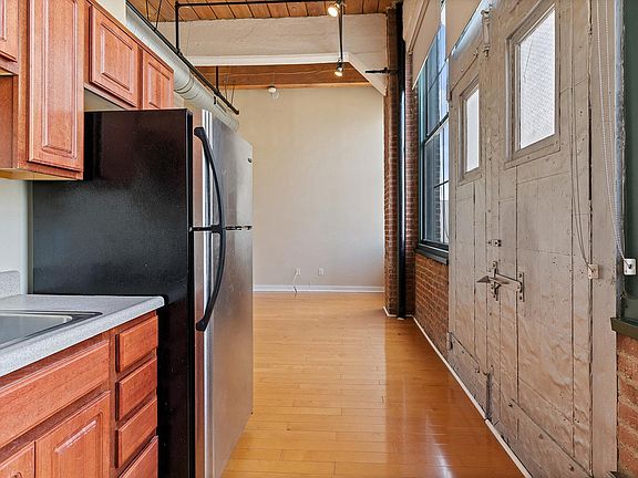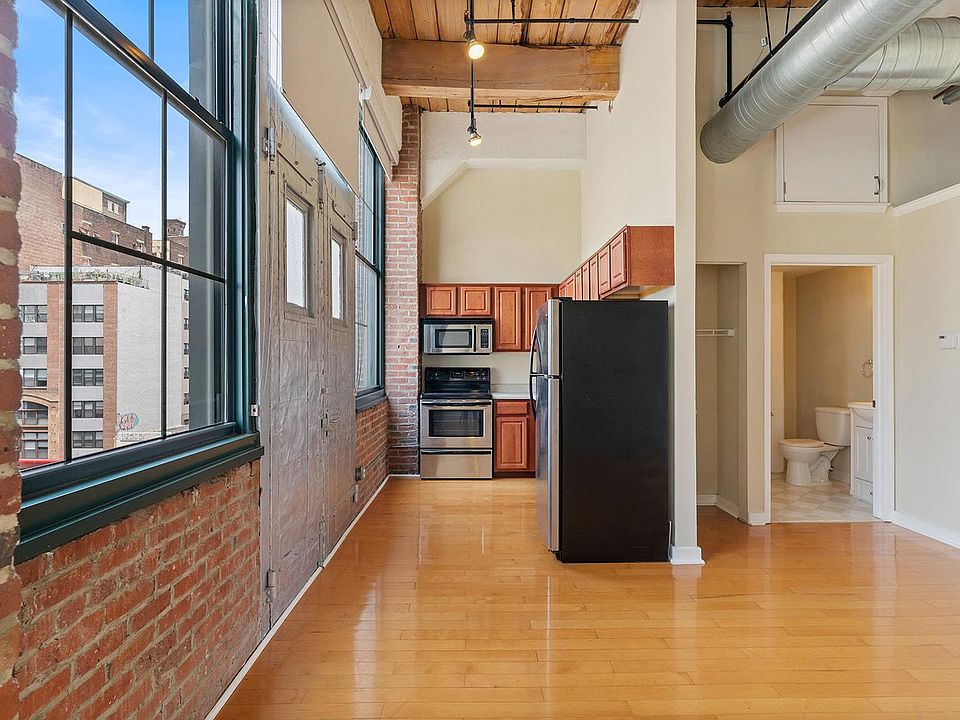 Western facing wall of oversized windows wooden beams, original brick walls, and open kitchen/living area layout. Central air and heat, stainless appliances, hardwood flooring, and character galore. View of city skyline.