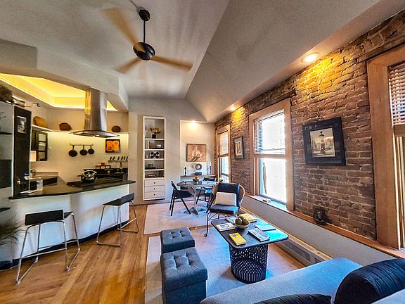 If you like the Brooklyn vibe then you want to be in the heart of it -Boerum Hill. This 2 bedroom 925 sq ft apartment is located in Boerum Hills' Historic District of Atlantic ave. The apt. is hIgh ceilinged with large windows, it has a bit of a loft feel. The kitchen has new appliances and island seating for casual meals. The dining and living room areas and a dramatic open stairway to the private deck are adjacent . A skylite double sink bathroom and laundry alcove with washer/dryer are in the middle of the apt . To the rear, are the 2 bedrooms. The primary bedroom has a working wood fireplace and rear glass wall overlooking lovely gardens . The second bedroom, large enough for a king bed , also has large expanse of glass with garden views. Apartment amenities include, central air conditioning , built ins, ceiling fans , large bedroom closets as well as a hall closet and storage available for bikes on the lower level. But best of all -A full open staircase leads to the large south facing, private rooftop deck. The views are terrific. Gardens to the south and downtown Brooklyn to the north. Locally there' is a wide selection of restaurants, good grocery and retail shopping , walking distance to Brooklyn Bridge Park, BAM, and the Barclay Center plus seven subway lines the best transport in the entire city.