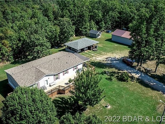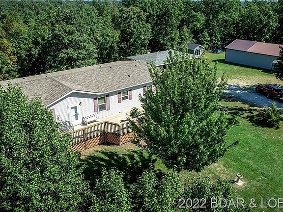 Fuqua DoubleWide Manuf. Home with full front Deck on full poured concrete slab with footings sitting on approx. 35 acres of open/wooded grounds with wildlife galore! Deer visible nightly from deck and turkey often! Detached 3 car stick built Carport, Storage Shed, and 30x48 insulated Garage/Shop Building with electric and wood stove heat and concrete floor and mega shelves! Located 1/2 mile from stoplight in Laurie on Hwy. O for convenient living behind 55+ Cougar Ridge Manuf. Home Park for quiet living. Property has been surveyed, gentle and moderate terrain with small creek running through a part of property. This parcel/home will sell only after front park sells or can sell with the manuf. home park. Owner is a licensed realtor in State of Mo.