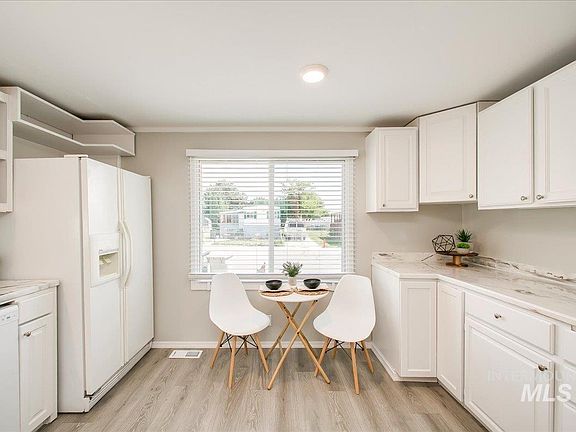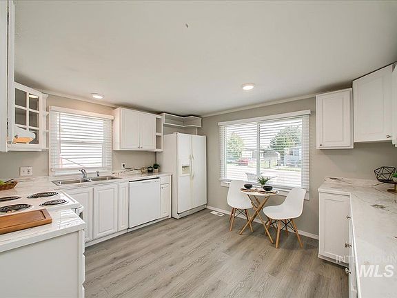 Adorable, FULLY REMODELED 3-bed, 1-bath manufactured home with Huge covered front porch and storage shed - located in the all-ages community of Rustic Acres, centrally located and close to The Village and Boise Towne Square Mall. All NEW LVP flooring in the kitchen, living room and hallway; NEW carpet in all 3 bedrooms; NEW epoxy kitchen countertops, freshly painted cabinets; NEW interior paint and trim throughout; NEW epoxy bathroom countertops; NEW LED lighting throughout; NEW exterior paint plus newly renovated deck and awning with new TPO roof. Central AC and furnace are a few years old, TPO roof several years old. Pease note: sale is for home only and is on a rented lot; lot rent is $950/month. Financing available through alternative lenders. Please call listing agent for details and a list of lenders. Pre-approval is required with an offer. Full price offer to include seller concessions of 6 months free lot rent.