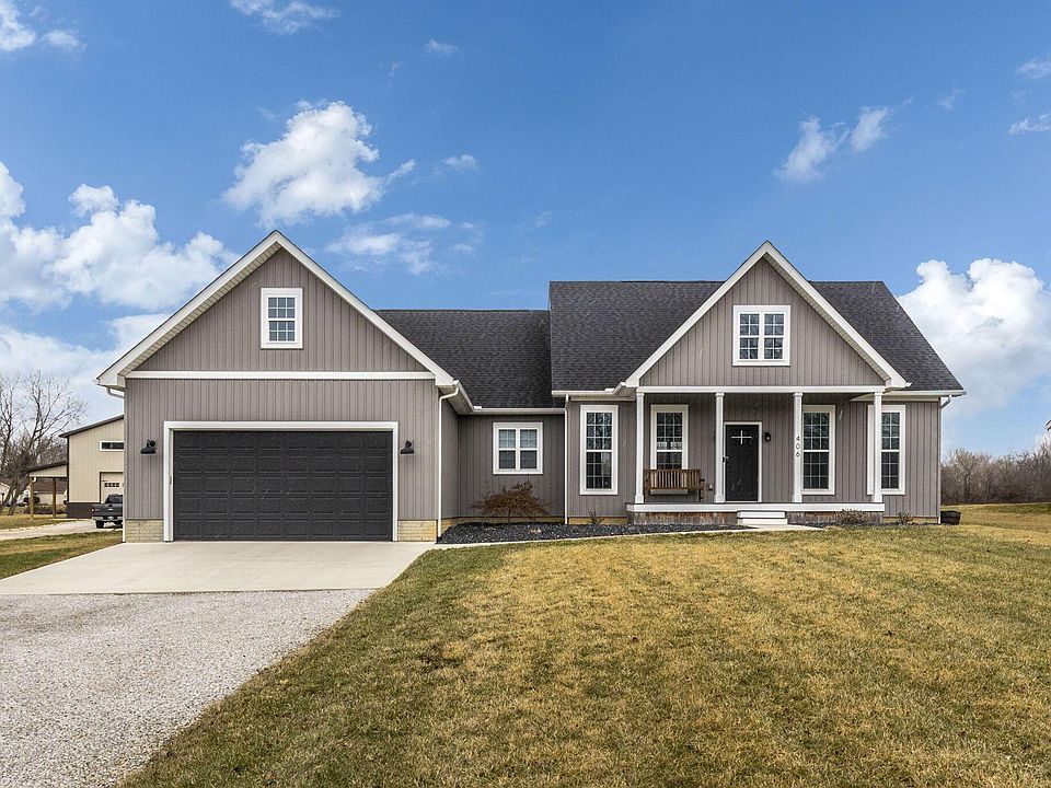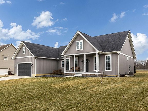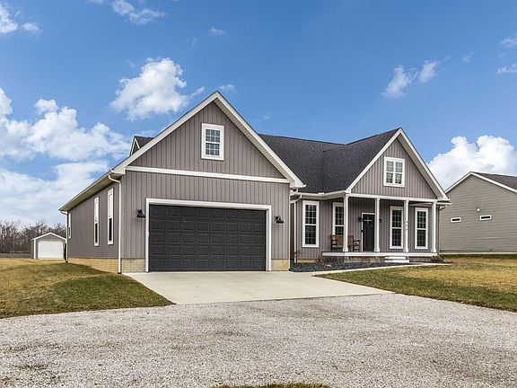 Welcome to this custom built ranch home situated on 2 acres. Open floor plan featuring a dining room and great room w/high ceilings. The kitchen boasts granite countertops, custom cabinets, center island eating bar, stainless steel appliances and a walk-in pantry w/barn door access! 1st Floor Owners Suite w/tray ceilings, celing fan, large walk-in closet w/built-ins and private bath. 2 additional bedrooms and full bath. Full poured basement, ready to be finished. Enjoy the rear deck/covered porch & additional out-buiding for storage. You won't want to miss this home! See A2A Remarks.
