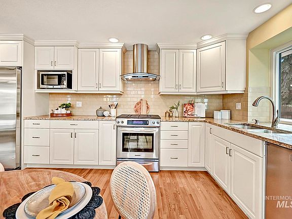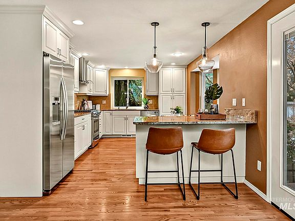If privacy is what you are looking for then look no further. This is a great floorplan located in one of SE Boise's best neighborhoods - Lakewood. This gorgeous 4-bedroom home has been remodeled throughout with new Champion Energy efficient windows and dual heating zones. The private backyard-facing oversized Owner's suite upstairs will catch your attention with 2 closets and a remodeled bathroom including dual vanities, a luxurious walk-in shower, and granite countertops. Wood floors are featured upstairs and downstairs and flow down the staircase to bay windows with plantation shutters. This will lead you to a beautiful kitchen that has been completely remodeled from the ground up with all the amenities needed. The backyard is private and beautifully landscaped with a covered patio featuring skylights and ceiling fans; perfect for entertaining! Come see this home before it's too late!